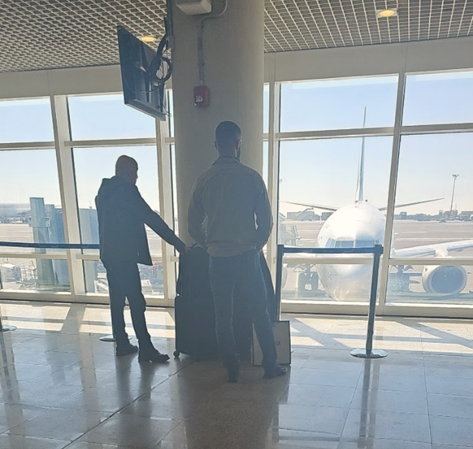 Horatiu Potra (left) waits at the gate in Addis Ababa for the flight to Goma on November 27, 2023.
